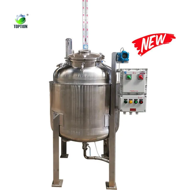 TOPTION tank ħażna azzar istainless jappoġġja personalizzazzjoni professjonali, saff doppju, saff wieħed, u adattament firxa wiesgħa ta 'kapaċità. Għall-iffriżar minn qabel tal-alkoħol qabel l-estrazzjoni ċentrifugali tal-etanol, agħżel saff doppju, li jaqbel mar-refriġeratur biex tikseb l-effett ta' qabel l-iffriżar. Għall-ħżin likwidu wara l-filtrazzjoni, jintgħażel tank tal-ħżin ta' saff wieħed, li jintuża l-aktar għall-buffering qabel ma jidħol fl-evaporatur biex jinkiseb l-iskop ta' għalf stabbli u kontinwu.
